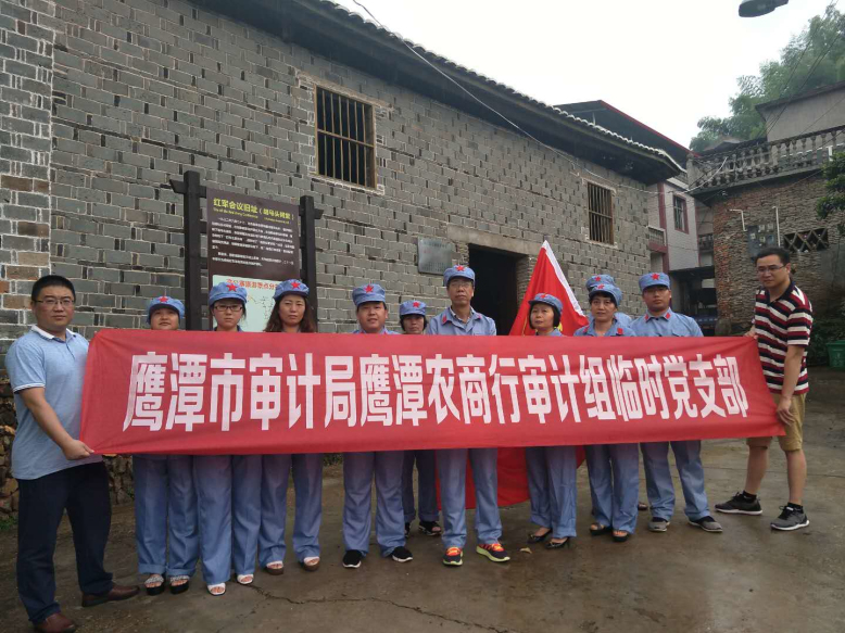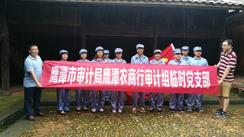 在赶往目的的途中,天公不作美,时晴时雨,因山路多处塌方,挡住去路,数次改变路线,才到目的地。到目的地之后,天气更糟,雨越下越大。审计人员更换好红军衣帽,背着仿制枪支,趁雨水渐停后,来到胡马头村红十军赤警师师部旧址,参观方志敏发动群众起义的胡家祠堂,向当地老人了解当年红军发起群众起义的情景和故事。祠堂屋檐板两侧分别写着“打倒土豪劣绅”和“造成红军铁军”十二个大字。
