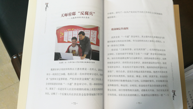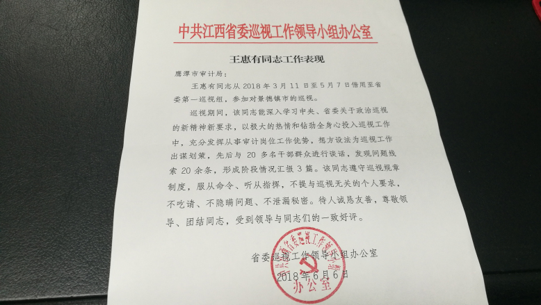 “巡视期间,王惠有同志深入学习中央、省委关于政治巡视的新精神新要求,以极大的热情和钻劲全身心投入巡视工作中,充分发挥从事审计岗位工作优势,想方设法为巡视工作出谋划策------”这是近日,鹰潭市审计局收到中共江西省委巡视工作领导小组办公室发来信函的部分内容。