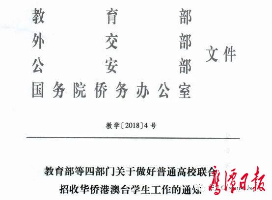 2018年5月30日,教育部、外交部、公安部、国务院侨务办公室等四部门就普通高校联合招收华侨港澳台学生(以下简称全国联招)作了最新的规定。7月4日,联招办对外公布此文。